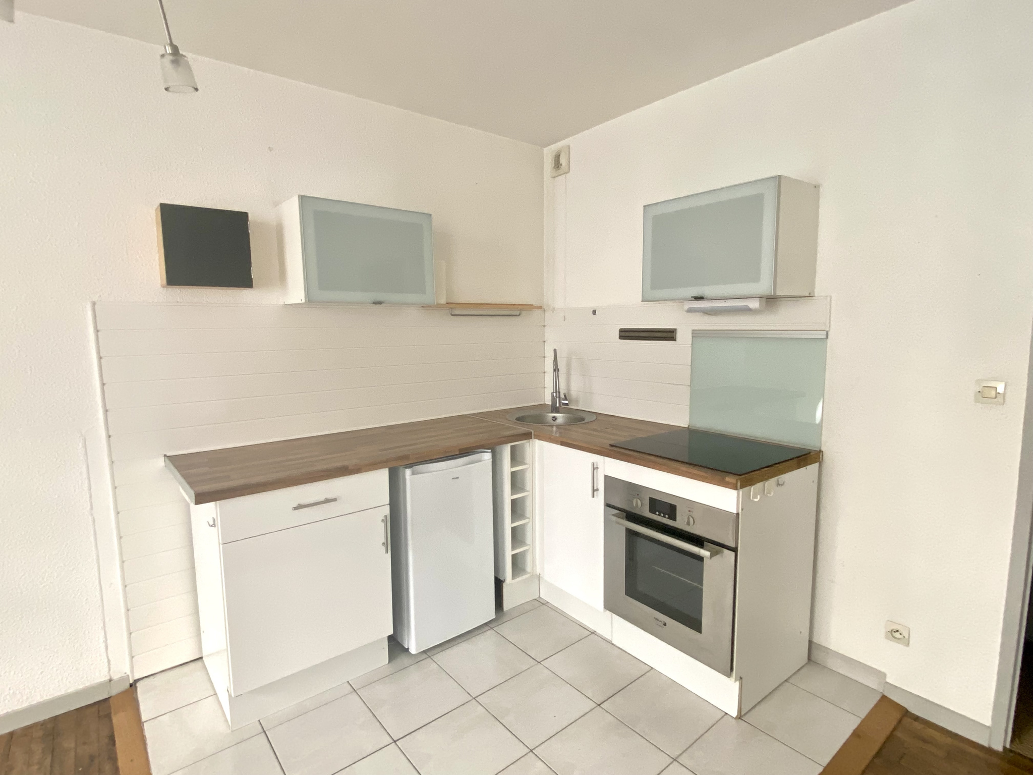 Au rez-de-chaussée, appartement de type II comprenant: Entrée/dégagement, séjour avec cuisine aménagée semi-équipée (réfrigérateur, table de cuisson induction, four), chambre, salle de bains, wc séparés.
